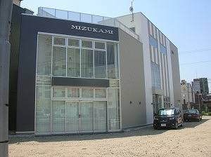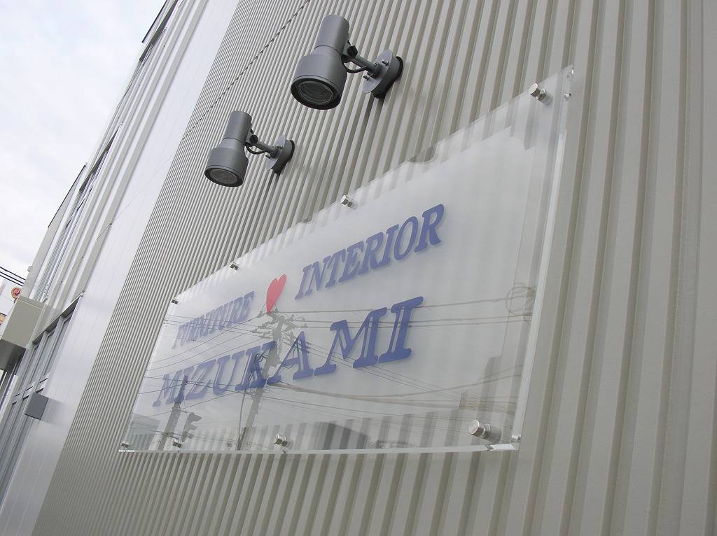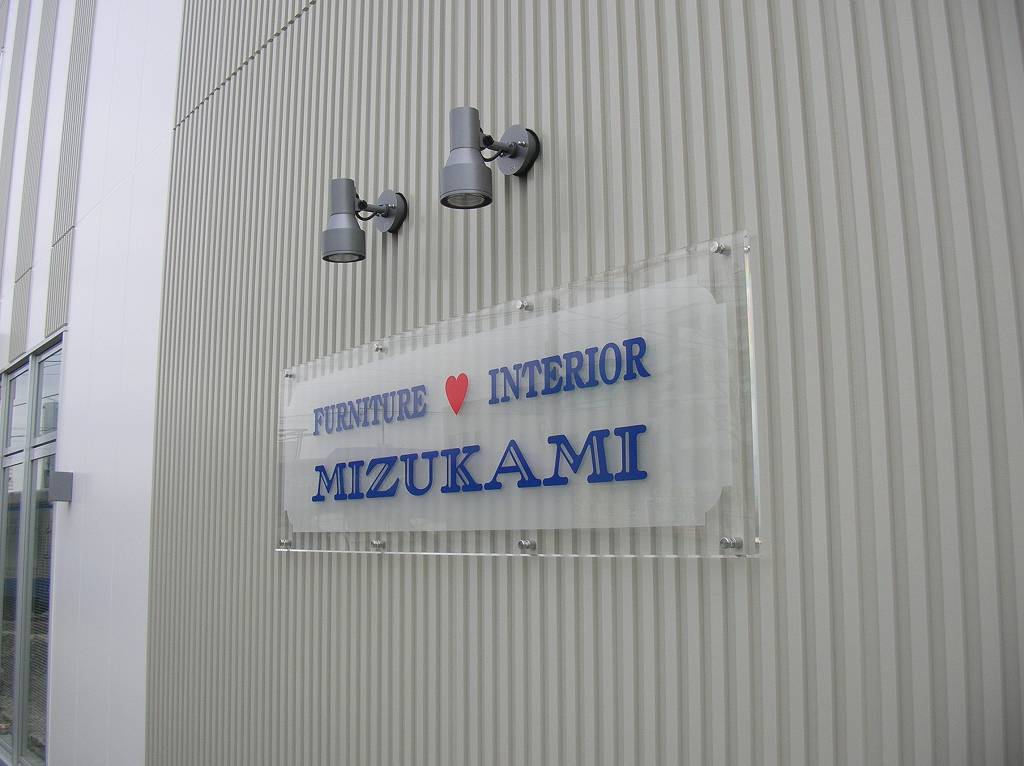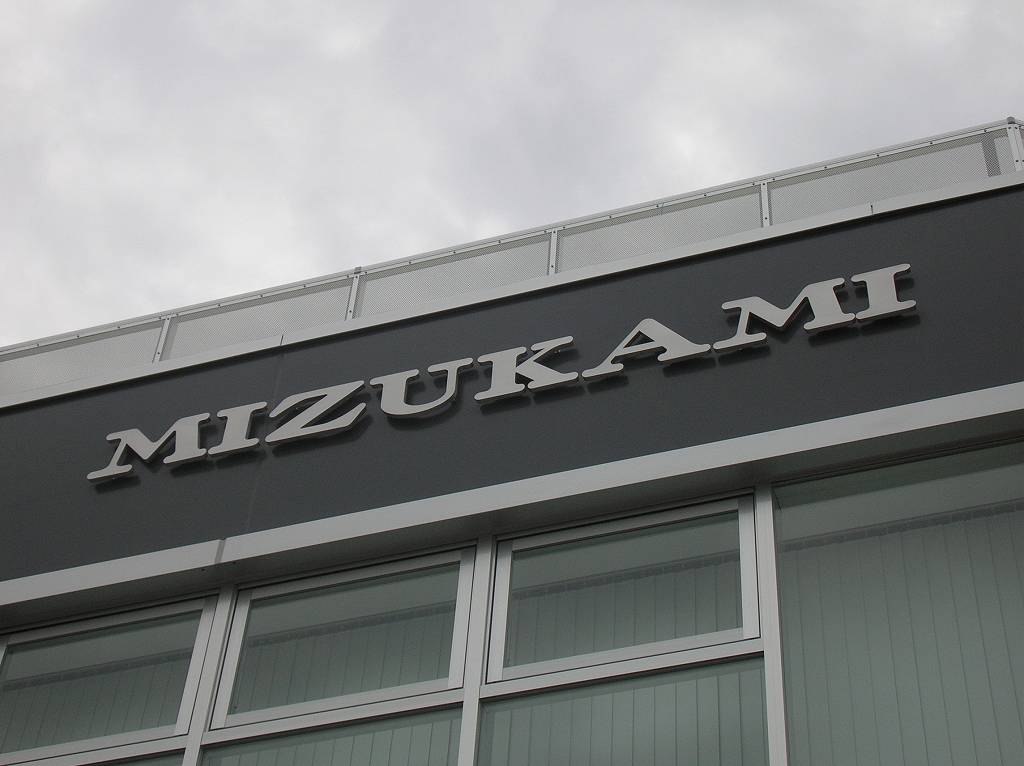 「MIZUKAMI」のローマ字のみのシンプルな店頭サイン。